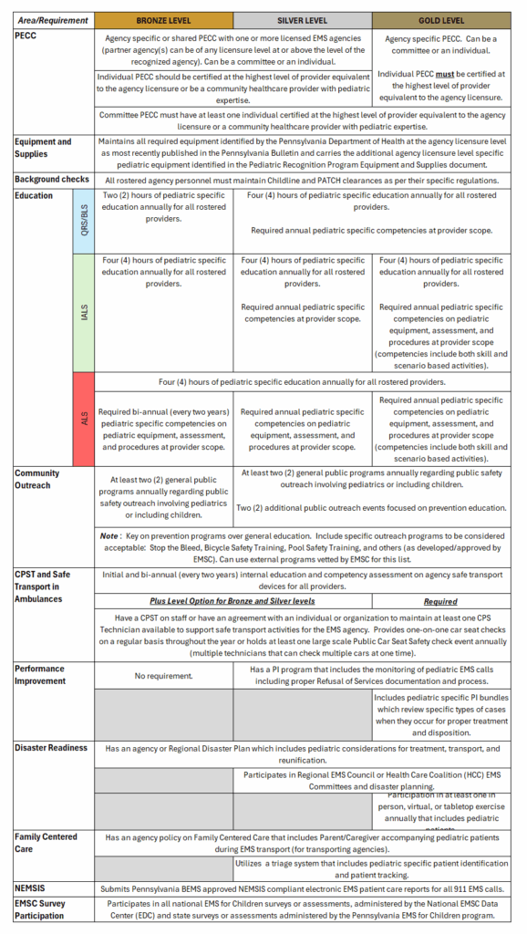 Pennsylvania’s Pediatric Readiness Recognition Program for EMS works around a set of focus areas with specific criteria for each area, escalating across three levels of recognition. These criteria and requirements were taken from the original program along with additional items added from national standards and industry expectations. The program was developed by a group of peers including Pediatric Emergency Care Coordinators, agency leaders, medical directors, and regional EMS council representatives. Altogether, the program takes pediatric readiness to a higher level of engagement and responsibility of the agency and its clinical team.
