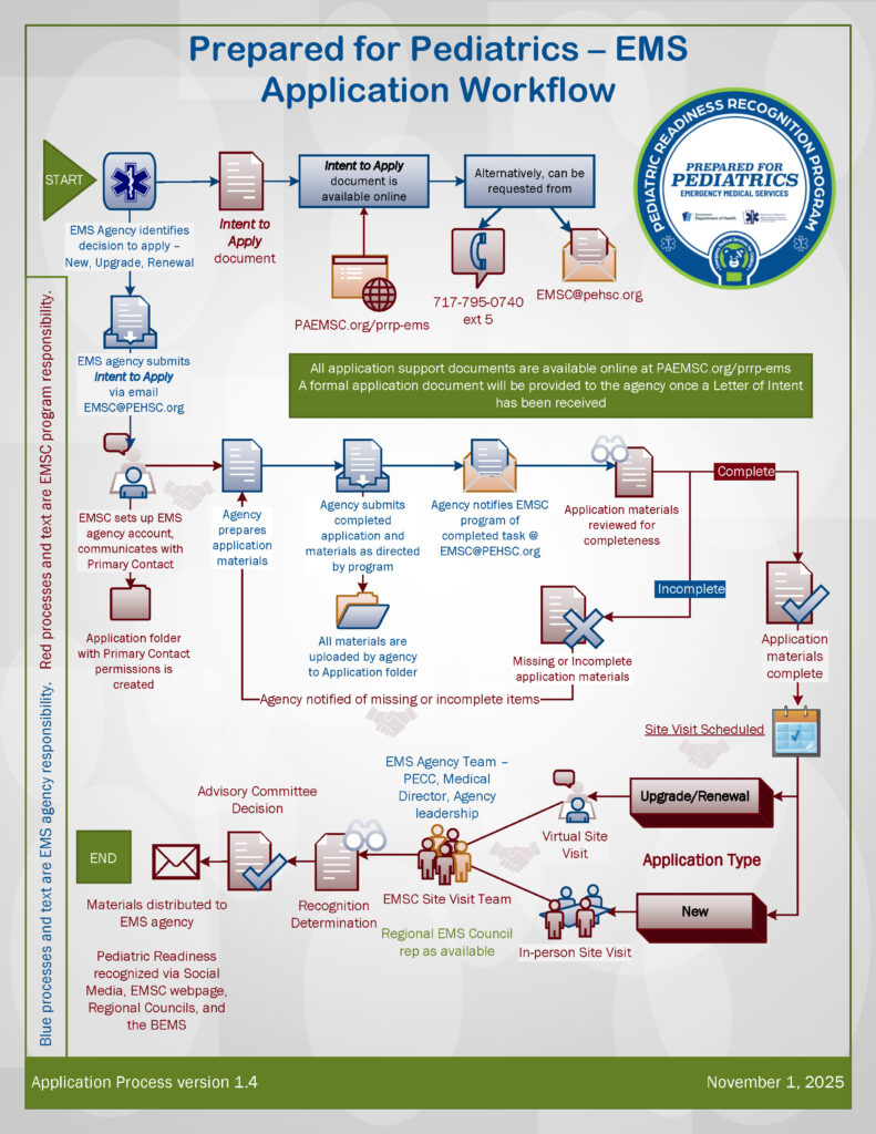 All interested Pennsylvania Licensed EMS agencies should download the program handbook and review the program outline and requirements before deciding which level they would like to apply to. Once ready and able to validate compliance with the level they intend to apply to for at least the previous 12 months, the agency should submit a completed and signed Intent to Apply form via email to EMSC@PEHSC.org. Please refer to the Application Workflow and process description in the program handbook for all steps and requirements.